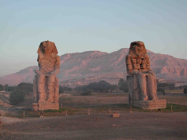 | Die Memnonkolosse - mal wieder im Sonnenaufgang. So ca. 5.30 Uhr in der Früh! Wir wollten schließlich alle früh im Tal der Könige sein, die 40°C vom Vortag hatten uns gereicht! | ![]() |