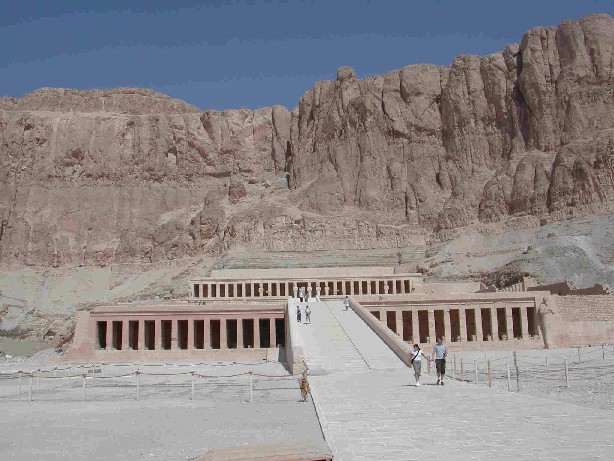 | Der Totentempel der Königin Hatschepsut. Ein komisches Gefühl war es doch auf den Stufen zu stehen und daran zu denken, dass vor nicht allzulanger Zeit dort ein Anschlag stattgefunden hat. Die Gegenwart der Tourismuspolizei war allerdings überall zu spüren. Leider war der Tempel während unseres Besuchs in weiten Teilen wegen Renovierung abgesperrt. | ||||