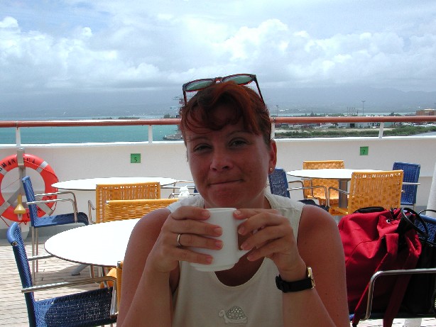 | Da es schon immer ein Traum von Uwe war...o.k. meiner auch....haben wir uns halt entschlossen den mal in Erfüllung gehen zu lassen. Relativ kurzfristig, über Web entdeckt, haben wir die Kreuzfahrt auf der Costa Romantica gebucht! Nach einer halben Weltreise mit der Air France sind wir glücklich in Guadeloupe gelandet und durften auf dem Schiff einchecken. Schon ein gewaltiger Anblick! So ein riesiges Schiff, schön weiß, viele nette Menschen, perfekte Organisation und eh wir uns versahen waren wir auch schon auf unserer Kabine. Lange haben wir es da aber nicht ausgehalten und sind losgezogen, das Schiff zu erkunden! Immer mit Lageplan versehen, denn es geht extrem schnell, dass man sich da verläuft. Uns hat gefallen was wir gesehen haben und konnten uns also auf 12 aufregende Tage freuen! Mitternacht lief das Schiff aus, unsere erste Nacht auf See.....bei Mondenschein, also richtig romantisch! Sollte ja auch unsere vorgezogene Hochzeitsreise für den 10. Hochzeitstag sein! | ||