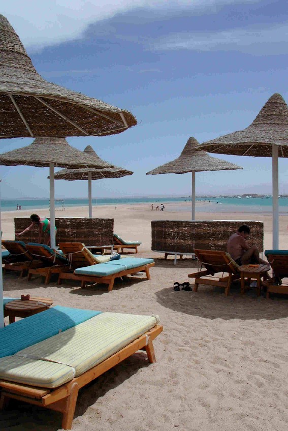 Nach dem Ausschlafen sind wir sofort zum Strand, der allerdings war ziemlich enttäuschend. Zwar Sandstrand und nette Liegen mit Sonnenschirm, aber klein und das Wasser sah eigentlich auch eher nach Nordsee denn nach Rotem Meer aus! Hurghada an sich kann man nur als gruselig bezeichnen. Tourismus pur, Wüstenlandschaft, total aufdringliche Ägypter und ziemlich dreckig. Kurz und gut nicht nach unserem Geschmack und auch der Ausflug in ein Unterwassernaturschutzgebiet konnte uns nicht entschädigen. Da bekamen wir zwar die versprochenen Fische zu Gesicht, aber auch mindestens 50 Touristen mit Flossen und Schnorchel...